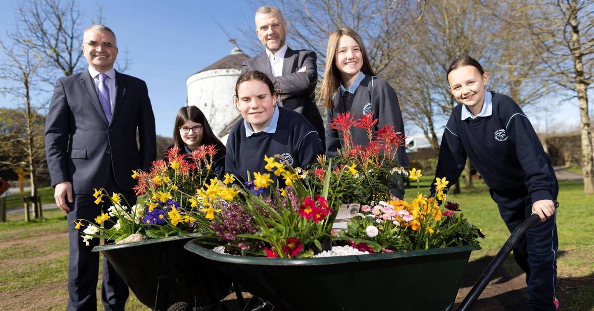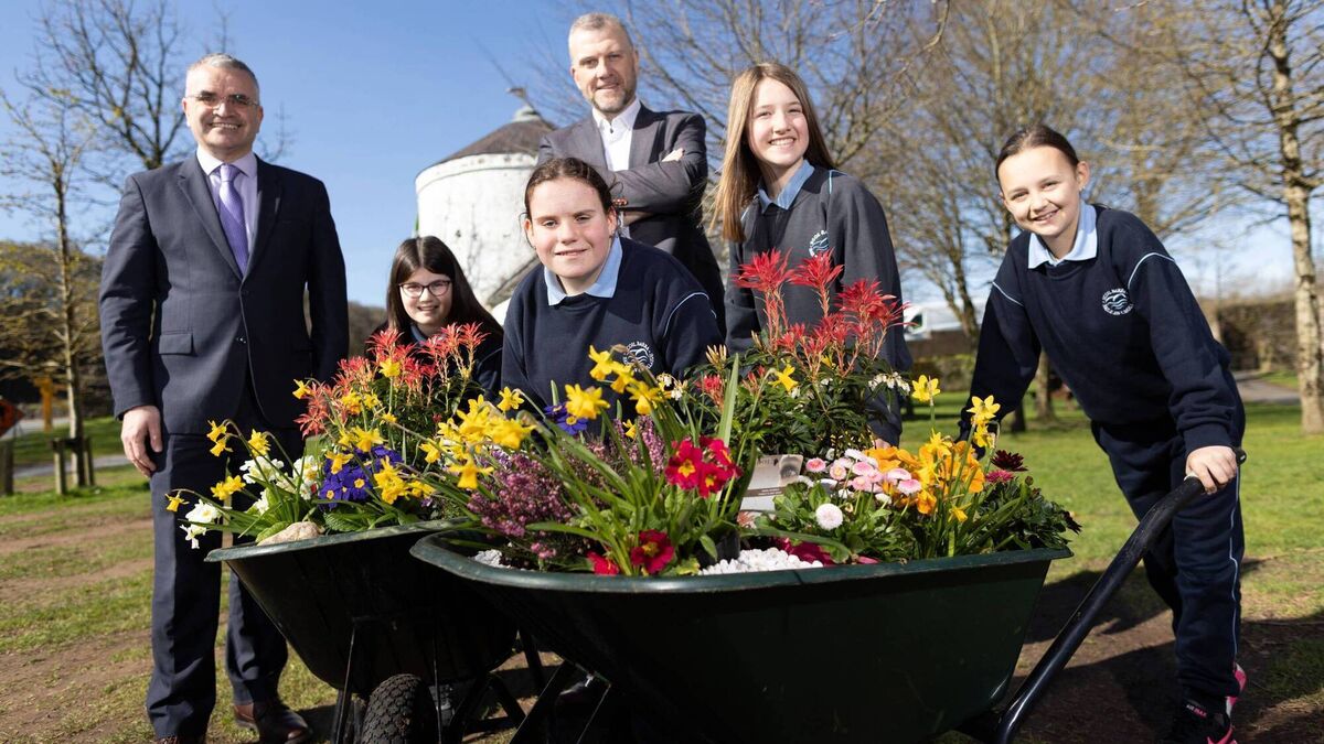 Minister for Rural and Community Development and the Gaeltacht, Dara Calleary TD, officially launching the 2025 SuperValu TidyTowns competition in Regional Park, Ballincollig, on Monday. Ballincollig was named as Ireland's tidiest town 2024. Pictured with the minister was Luke Hanlon, managing director SuperValu, and pupils from Scoil Barra, Ballincollig, Ciara MacCannon (11), Monika Vondrackova (13), Clara Moynihan (12), Hailey O’Callaghan (11). Photo: Julien Behal.