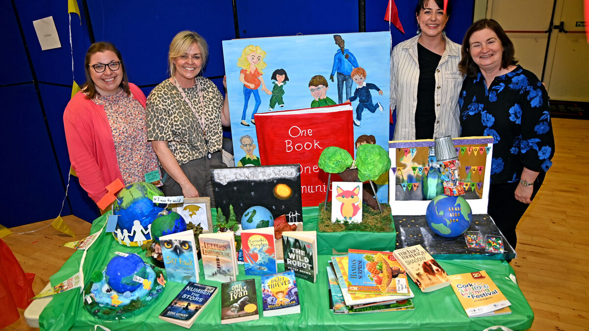 Megan Sarl, Maeve Heaphy, Muireann Kelleher, and Íde Ní Dhubháin from One Book One Community at the Mahon Community Learning Expo at the Mahon Community Centre.