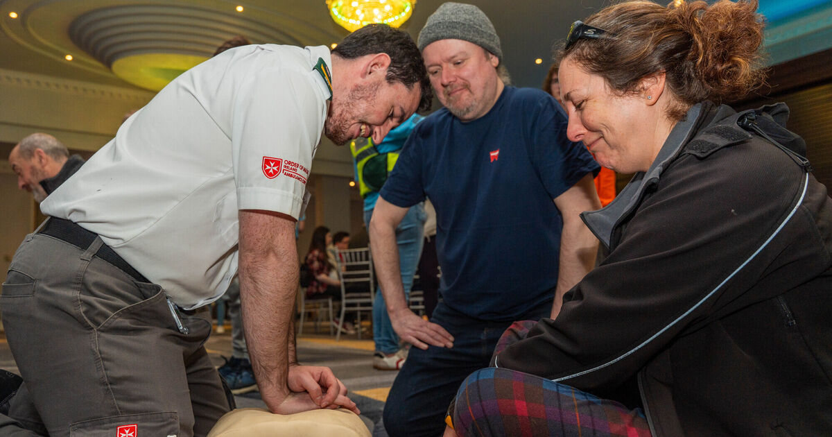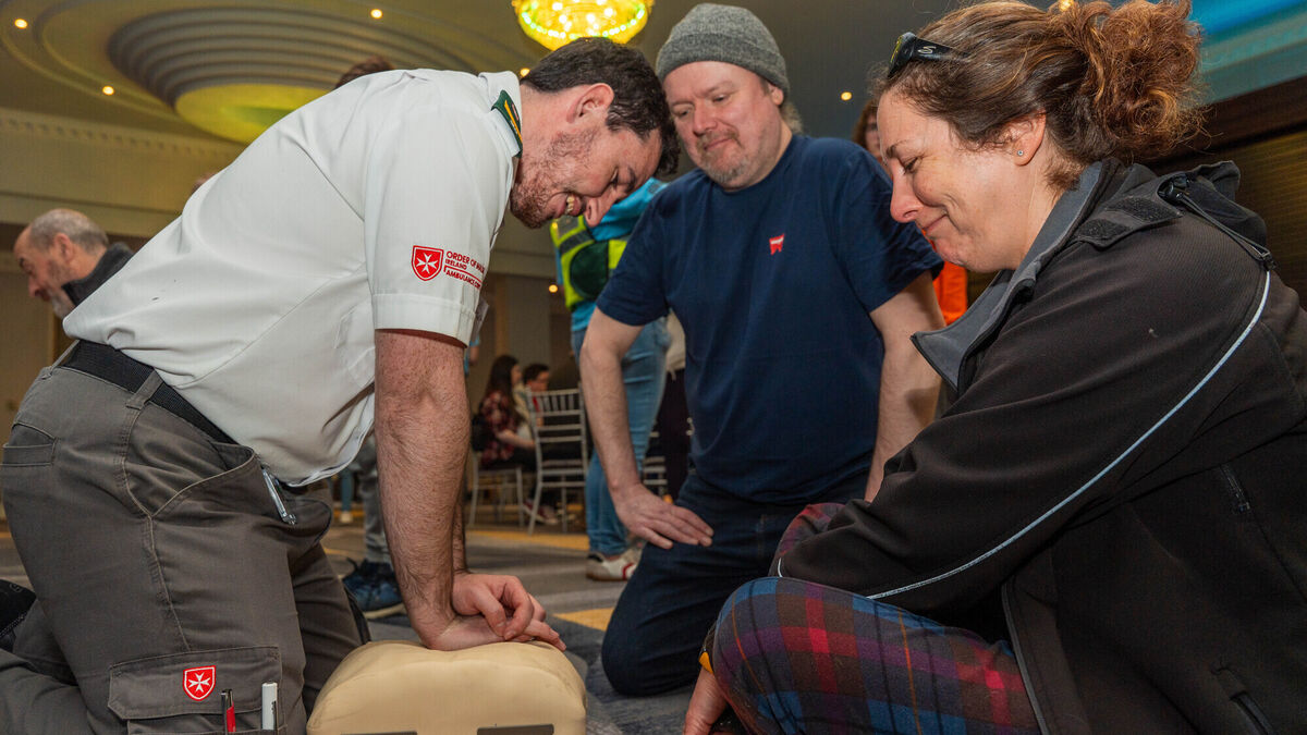 Eoghan Harrington from the Order of Malta demonstrates CPR for Emanuel Murray and Caitriona McGarry.