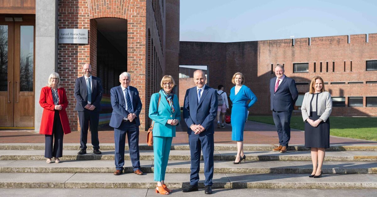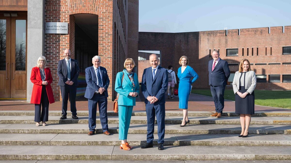 Josette O’Mullane, MTU innovation and enterprise manager; Professor Hugh McGlynn, vice president for Research and Innovation, MTU; Paul Healy, Innovation Centre manager, The Rubicon Centre; Professor Maggie Cusack, president, MTU; An Taoiseach Micheál Martin; Aoife McInerney; Cork programme manager, New Frontiers; Dan Barry, regional director, South & Southeast, Enterprise Ireland; and Ciara Concannon, National New Frontiers manager; at the New Frontiers Phase 2 Programme 2024 graduation, held at Munster Technological University (MTU), Bishopstown Campus. Photo: Joleen Cronin.