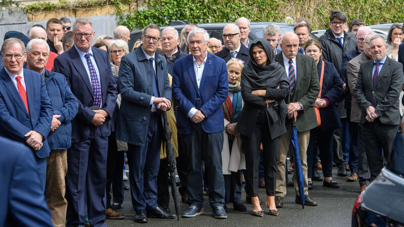 Mourners including Colm Burke TD, Conor Healy, Cork Chamber, Michael O'Flynn and minister of state Jerry Buttimer TD at the Church of the Holy Spirit, Dennehy’s Cross, Cork, attending the Liturgy of the Word for the late John Mullins. Picture: Dan Linehan