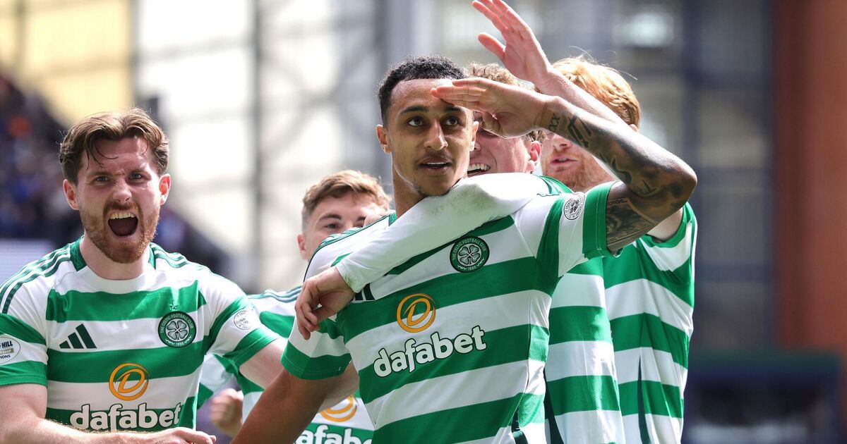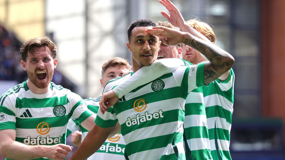 Celtic's Adam Idah (centre) celebrates scoring their side's first goal of the game with team-mates during the William Hill Premiership match at Ibrox Stadium, Glasgow. PICTURE: Steve Welsh/PA Wire.