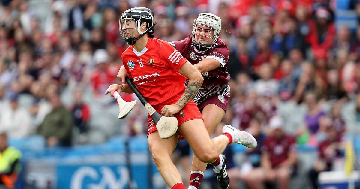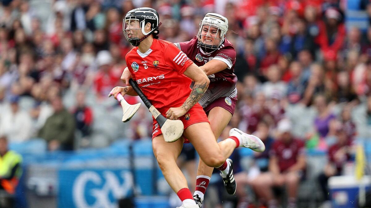 Cork's Ashling Thompson and Ailish O'Reilly of Galway at last year's senior camogie final.