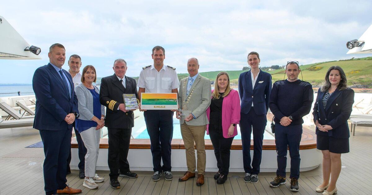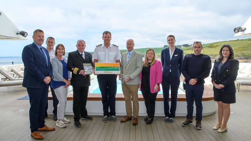 Independent councillor Alan Coleman, deputising for the Mayor of County Cork, makes a presentation to Francois-Xavier Avril, captain of Le Bellot, to mark its arrival into Kinsale as 2025’s inaugural cruise ship. Also pictured: Josselin Le Gall, Honorary Consul of France and maritime affairs; Philippe Marechal, hotel manager, Le Bellot; Noreen O’Mahony, senior executive officer, Cork County Council; Mark Clarke, Kinsale harbour master; Aoife Power, administrative officer, Cork County Council; Claire Ferault, travel ambassador, Le Bellot; Julian Renault, senior harbour master, and Valérie David-McGonnell, president of Alliance France de Cork. Picture: John Allen