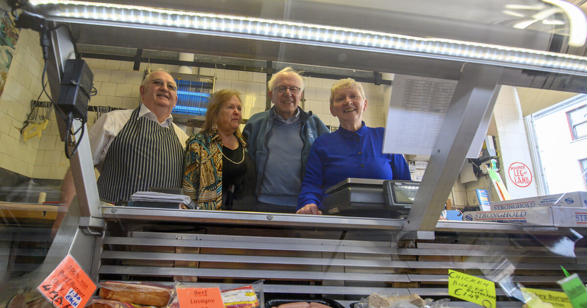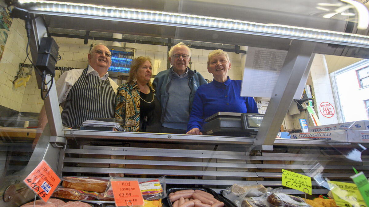 US senator Bernie Sanders with his wife Jane at Nolan's Butchers on Shandon Street with James and Marie Nolan prior to visiting the Mother Jones plaque on John Redmond St. Video Dan Linehan