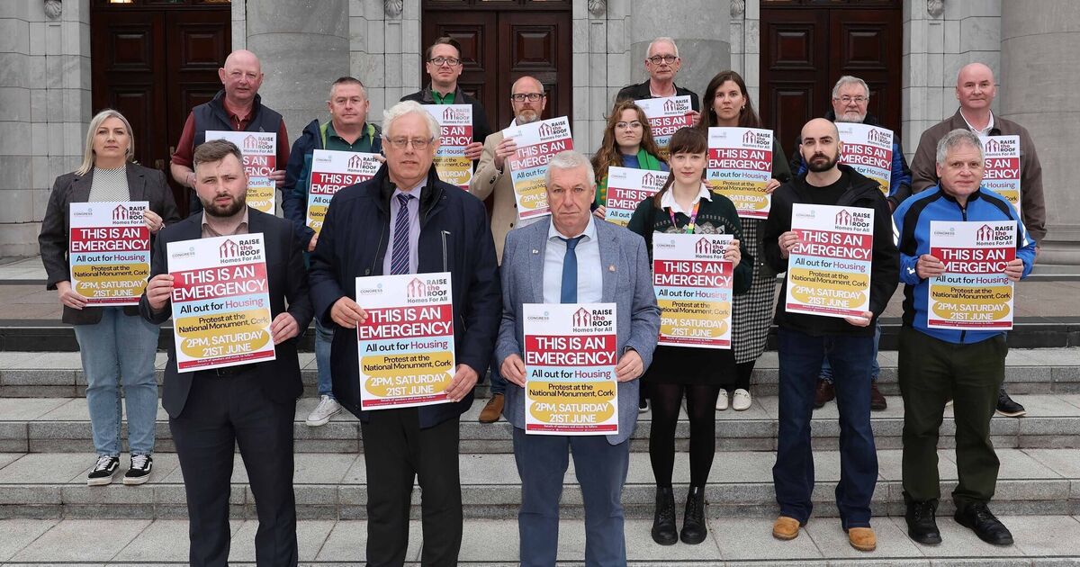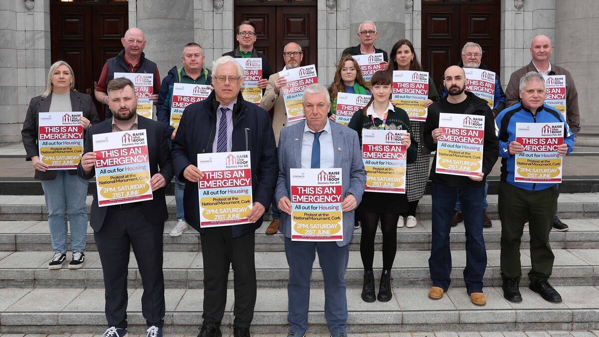 Cork TDs Eoghan Kenny, Labour Party and Thomas Gould, Sinn Féin, and Joe Kelly, SIPTU & Cork Council of Trade Unions (front row) with representatives from FORSA, UNITE, SIPTU, UCC Student Union and Cork city councillors announcing next months 'Raise the Roof' protest. Picture: Jim Coughlan.