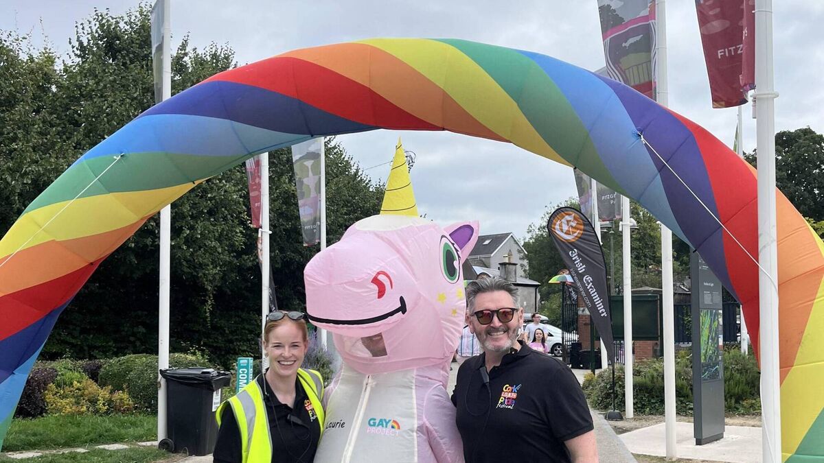 Celebrating the Cork Pride Family Fun Day in Fitzgerald's Park on Saturday were Mary White, Cork Pride; Konrad Im, (AKA Laurie the Unicorn), The Gay Project, and Darren FitzGerald, Cork Pride. Picture: Donal O'Keeffe.