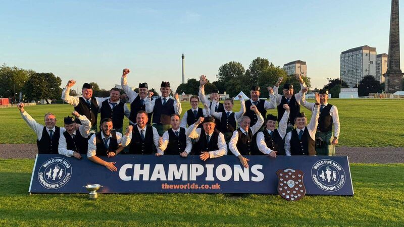 Carrigaline Pipe Band, who won the World Pipe Band Championships in Glasgow last Saturday. The band also won the World Championships in the drumming section.