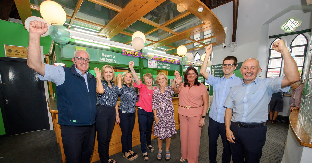 Staff at the Post Office on Edward Twomey Street, Clonakilty, celebrating its 100th anniversary, Included are from left, Donal Kelleher, Claudine Crowley, Nicola Enright, Miriam Cuinnea, Gobnait O'Donovan, Maxine Scanlon, Colm O'Sullivan and Liam Murphy. Picture Dan Linehan