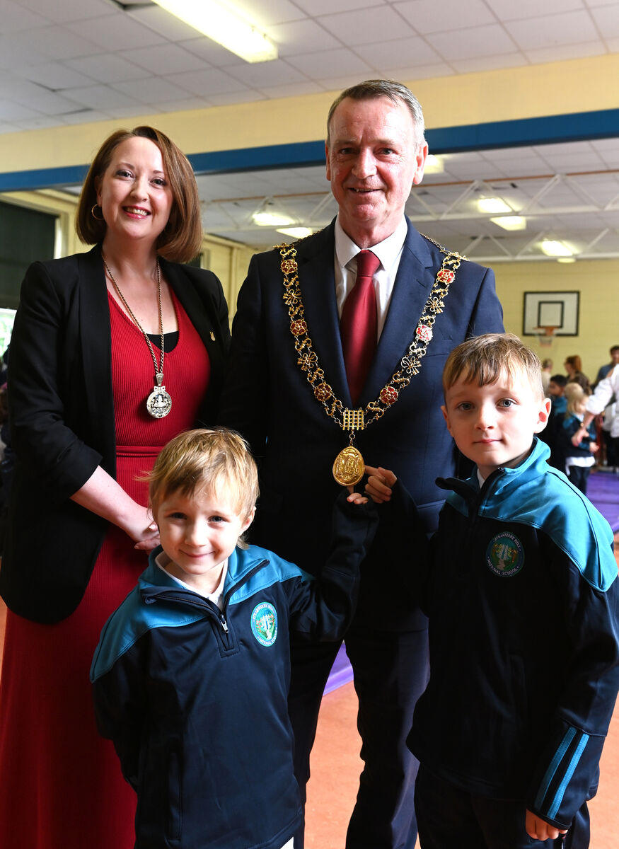 1. Brothers Theo and Ollie O'Sullivan meet Lord Mayor Cllr Fergal Dennehy and Lady Mayoress Karen Brennan at Strawberry Hill NS, Cork on Friday 19th September 2025. School visits 2025. Picture Larry Cummins