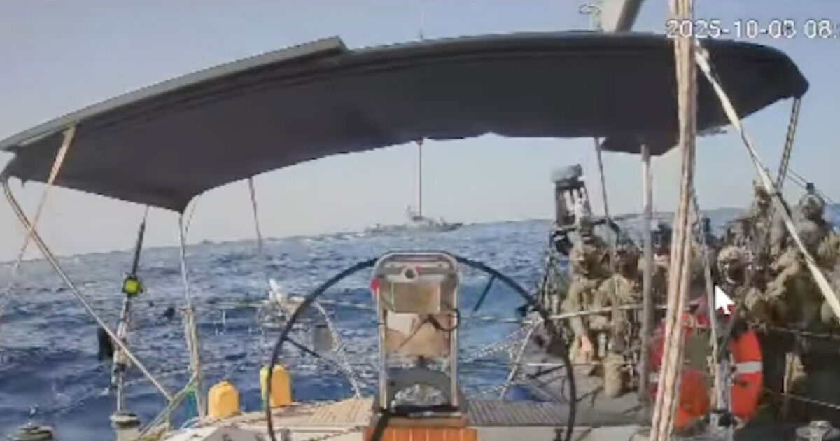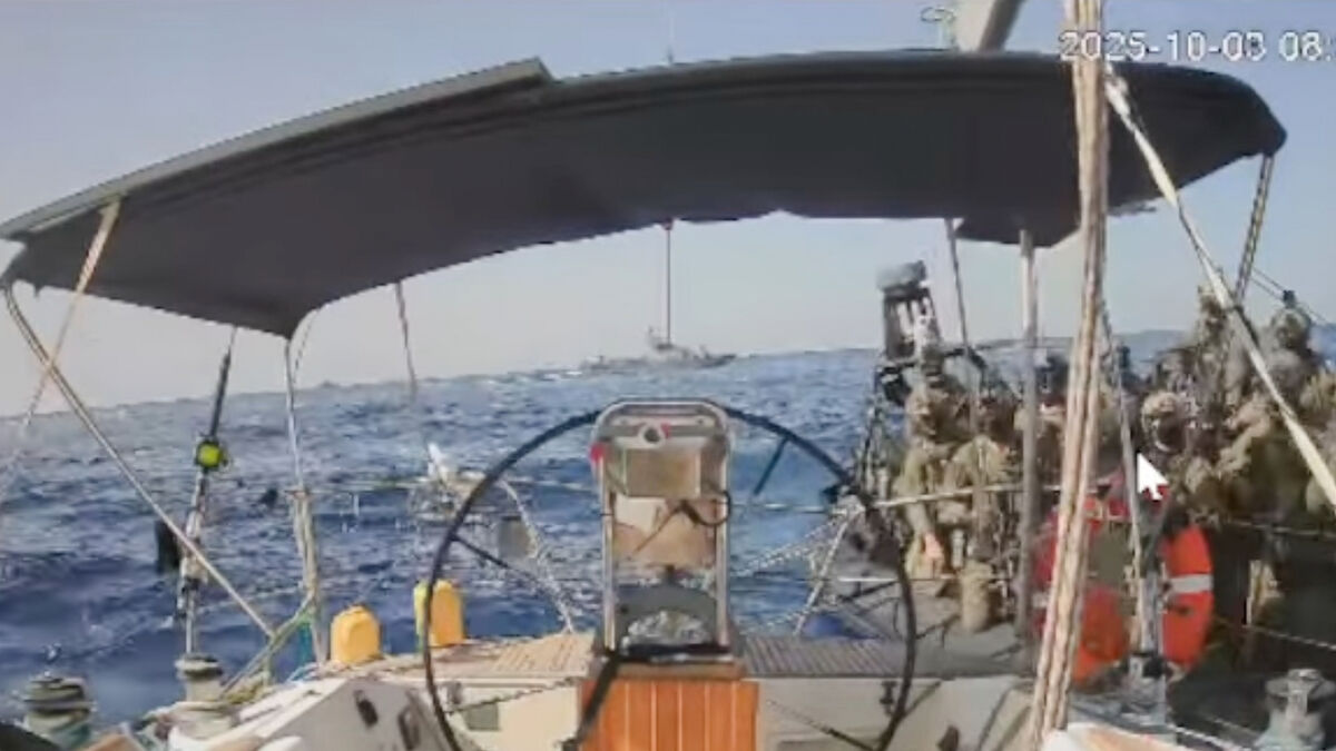 A screenshot from a video released by the Global Sumud Flotilla shows Israeli forces intercepting 'Marinette', the last boat from an international flotilla trying to break Israel's sea blockade, Picture: Global Sumud Flotilla via AP.