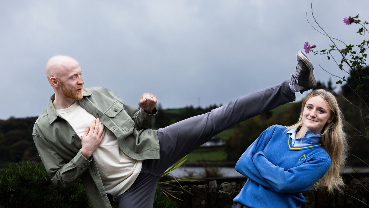 Tony Stephenson demonstrating balance and control with Éabha Deasy of Kinsale community School at the Igniting Entrepreneurship event in Rosscarbery. Picture: Darragh Kane.