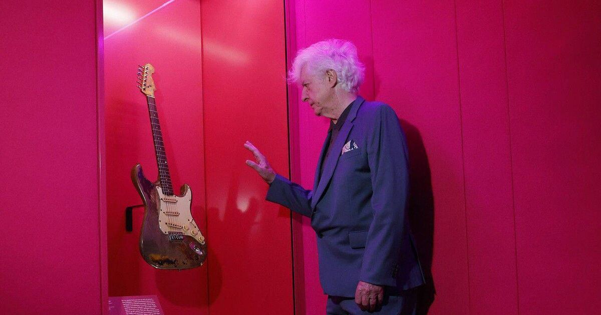 Donal Gallagher looking at the 1961 Fender Stratocaster owned and personally modified by his brother Rory.