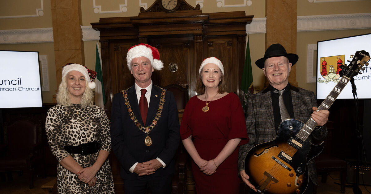 Performer Lady Fi, Lord Mayor Fergal Dennehy, Lady Mayoress Karen Brennan, and guitarist John McGrath at the launch of the 63rd Lord Mayor’s Gala Christmas Concert, which will be held on December 6 at Cork City Hall.