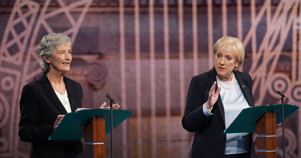 Independent candidate Catherine Connolly and Fine Gael candidate Heather Humphreys taking part in the final debate of the Irish presidential election campaign on Tuesday night. Picture: RTÉ