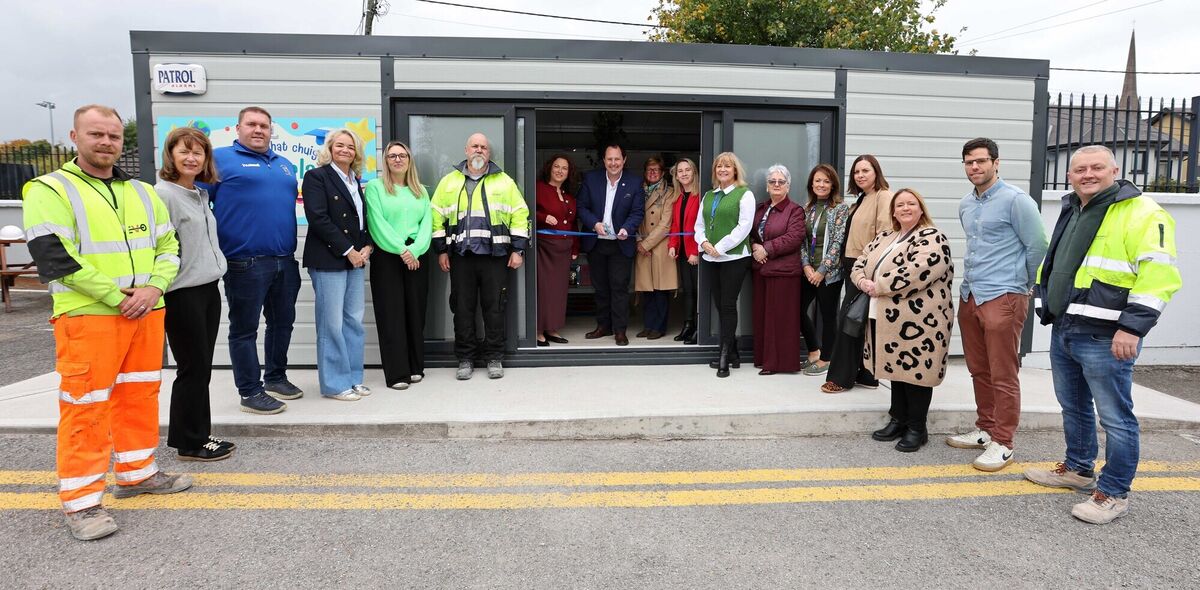 1.Cutting the ribbon at the new library at Scoil Ursula primary school in Blackrock are principal Liz Cronin, councillor Peter Horgan, former principal Linda Golden, and senator Laura Harmon, joined by staff members and sponsor representatives. Pictures: Jim Coughlan.
