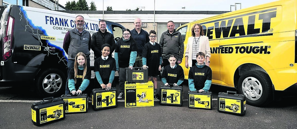 1.Frank McGowan, Frank Clark Ltd, sponsors; Ronan Clarke, Stanley Black & Decker, sponsors; Greg O’Halloran, sixth class teacher; Kieron Blacken, Stanley Black & Decker; and Kathryn Murphy, vice principal., with front: Caoimhe Digan, Rebecca Afoifa, Grace Curtin, Corrado Marino, Aoife Rourke and Alec McGarry pictured outside Holy Well National School, Carrigaline, with part of the extensive donation of power tools provided by Frank Clark Ltd and Stanley Black & Decker in support of the school’s new DIY skills programme.