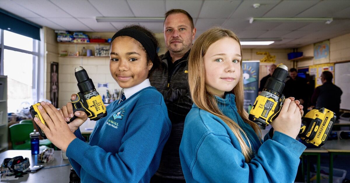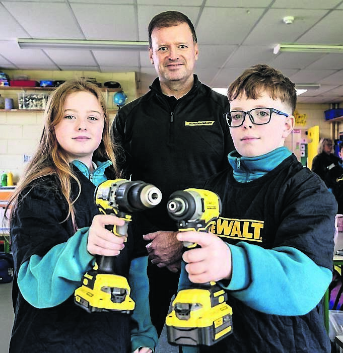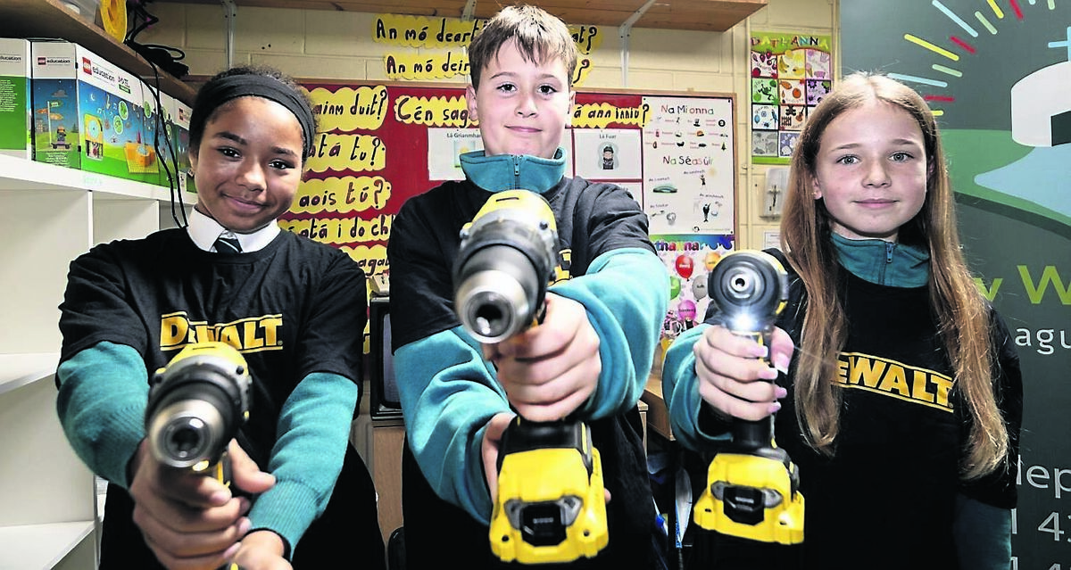 Sixth class pupils Rebecca Afoifa and Caoimhe Digan try out Stanley Black & Decker drills, Charlie’s Angels style, under the watchful eyes of the master, Kieron Blacken, at the launch of Holy Well National School’s DIY skills programme, supported by local businesses. Picture Chani Anderson.