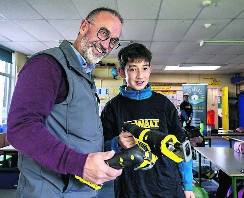 4.Frank McGowan, of Frank Clark Ltd, gives a demonstration of Stanley Black & Decker power tools to Frankie Moynihan at Holy Well National School.