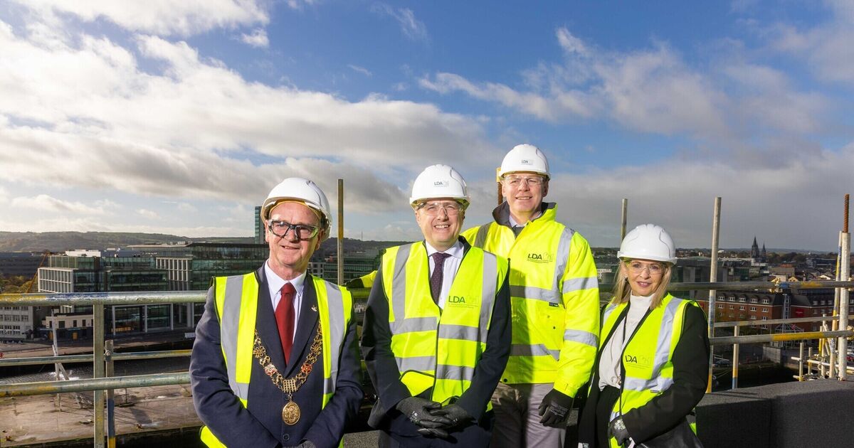 Lord Mayor Fergal Dennehy, housing minister James Browne, LDA chief John Coleman, and Cork City Council chief executive Valerie O’Sullivan at the topping-out
