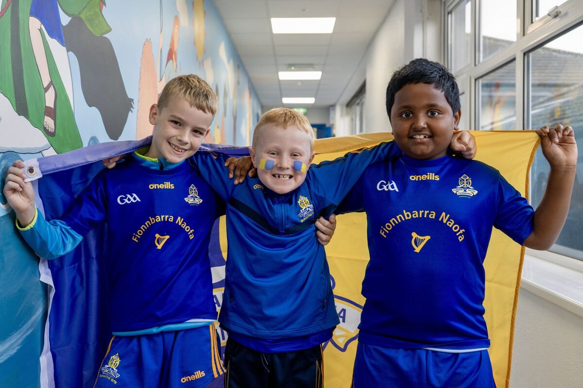 2.Ryan Wallace, Tomás Óg Delaney, and Suhas Malla fly the St. Finbarr’s flag inside Togher Boys National School support of their team’s place in the Cork Premier Senior Football Championship Final.