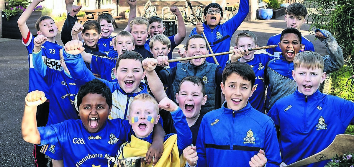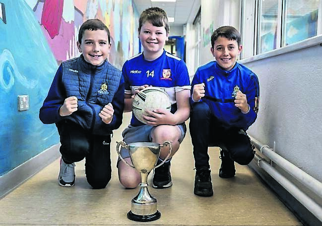 4.Kaiden O’Mahony, Issac Kenneally, and Jamie Hennessy proudly display the Sciath na Scol Cup at Togher Boys National School during Blue Jersey Day, for St Finbarr’s footballers.