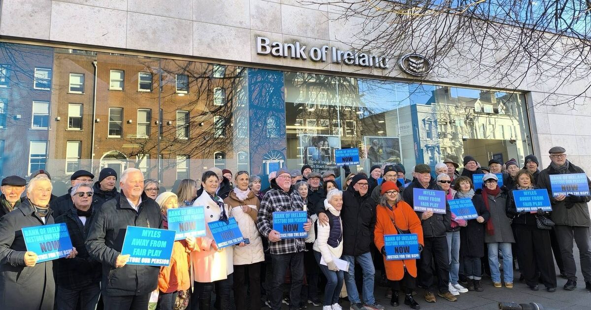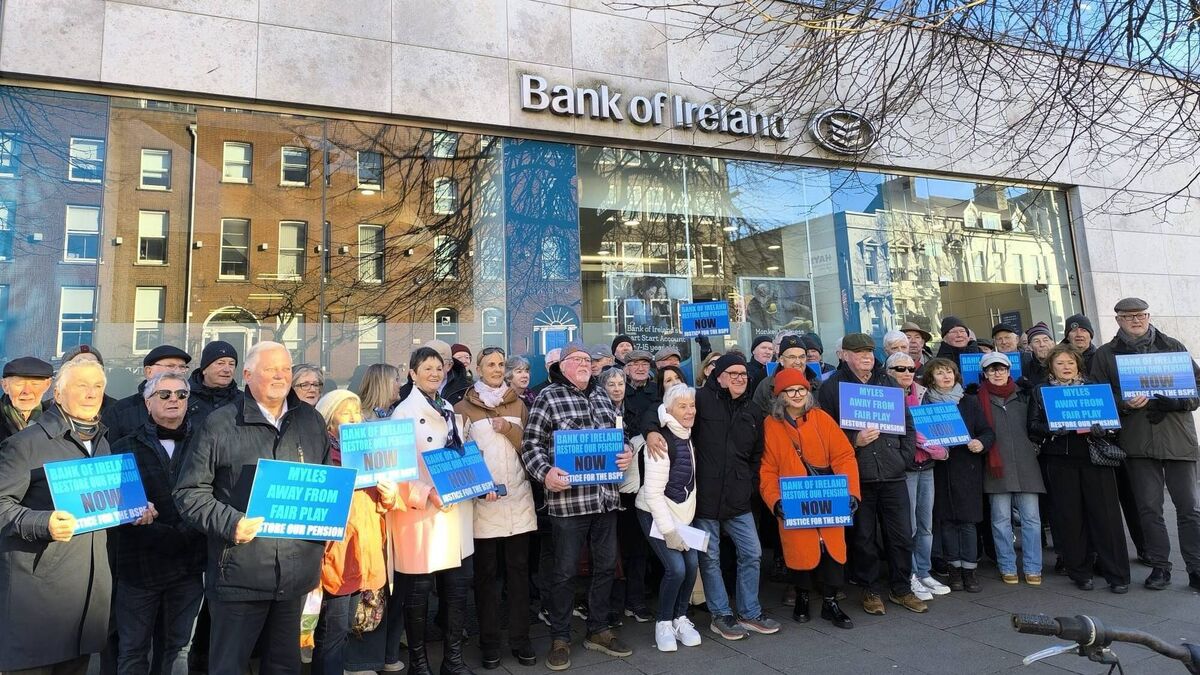 A group of 80 pension members protested to show their frustration, and to demand that the pension changes be reversed in light of the huge profits that Bank of Ireland are reporting.