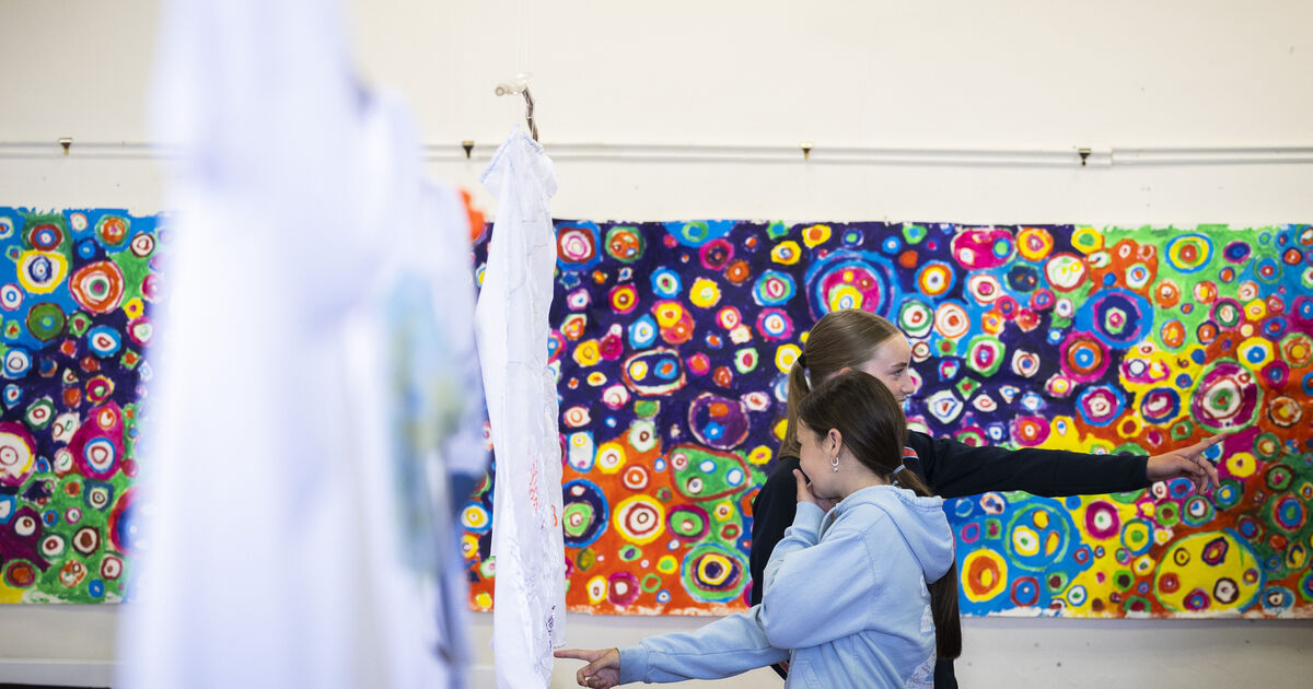 Students from 6th Class St Patrick's Girls NS admire their art work at Roam, a creative programme supporting wellbeing and social connection. Picture: Clare Keogh.