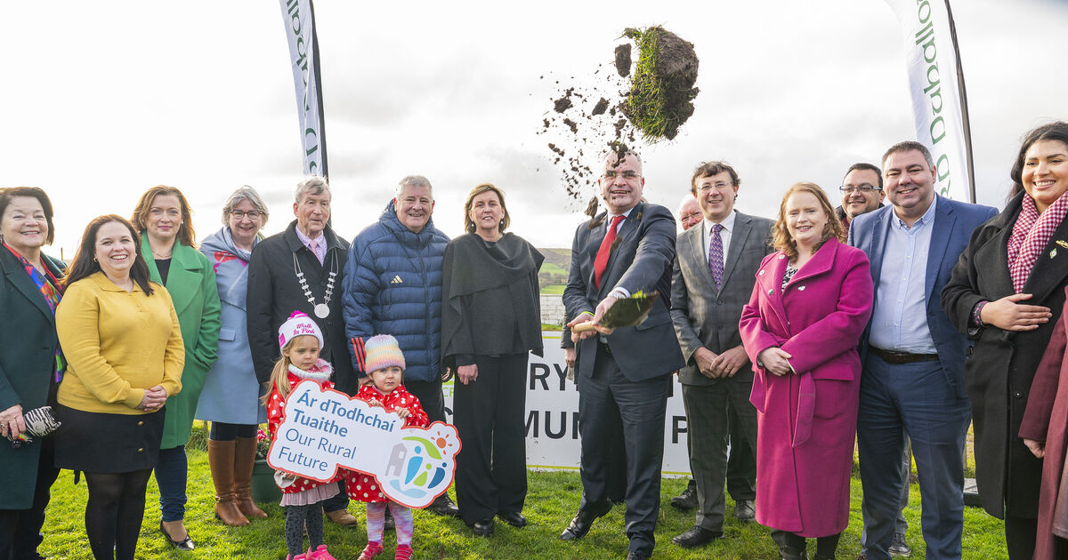 Ava and Rose Buckley from Knockraha, along with local elected politicians and committee members with Minister for Rural and Community Development and the Gaeltacht, Dara Calleary, in Rylane. Picture: Gerard McCarthy.