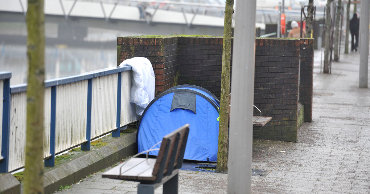 A small tent and duvet at a public seating area beside the River Lee, at Merchant's Quay, Cork. Pic; Larry Cummins