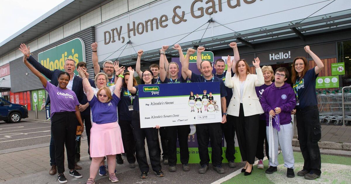 Staff at Woodies Turner’s Cross in Cork present a cheque to Tshego Pelo, from Childline; Aidan Stacey, CEO Down Syndrome Ireland; Jenny and Danny O’Connell, Down Syndrome Ireland; Jackie and Katie Connolly, Down Syndrome Ireland; and Siobhan Hanley, director, Cancer Fund for Children.