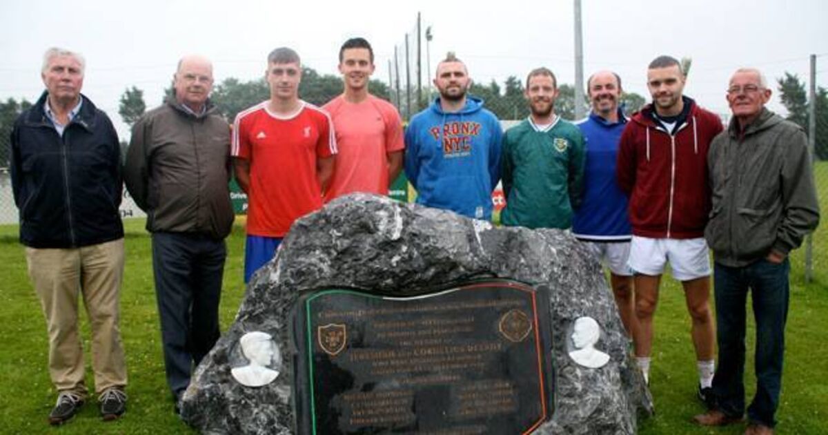 Members of Delanys Junior A Football Team with Club Officers Martin Knox Chairman, Denis O Flaherty Runai, and Kieran Foley Treasurer at unveiling of Plaque in memory of Corneilus and Jeremiah Delany in 2016. Pic : Derek Connolly.