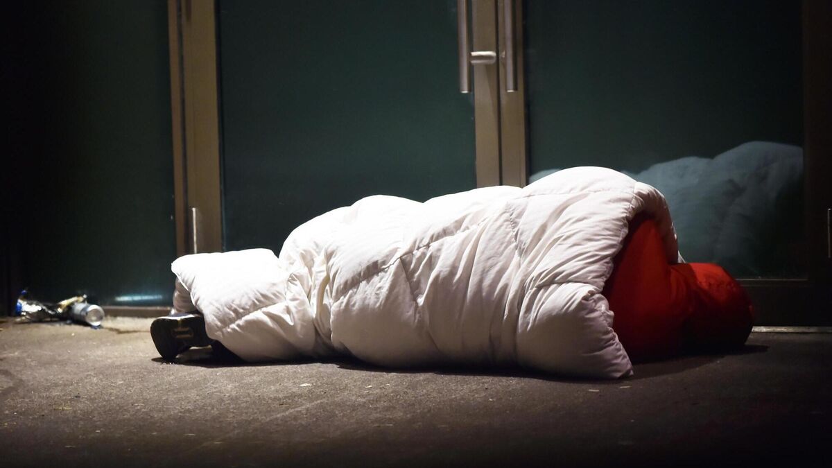 Outside Penney’s, two outreach workers from Cork Simon approach a person-shaped blue sleeping bag on the ground, wedged against the shop door, the doorway affording little shelter.