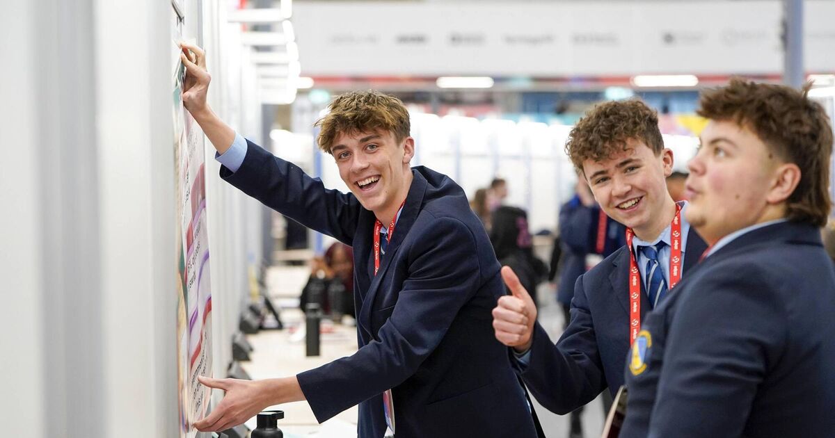 Sam Mahon, Connor Kingston and Charlie Hart from Mount St Michael , Co Cork, showcasing their project on day one of the 2026 Stripe YSTE.