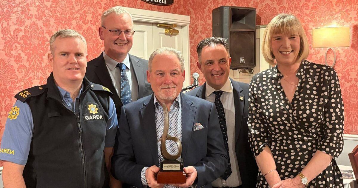 Brendan Murphy received his award from Garda Sean O’Dwyer — standing in for last year’s winner, Garda Tim McSweeney — and said he was accepting it on behalf of “the cooks, volunteer drivers, and many local clubs and organisations who fundraise for us”.