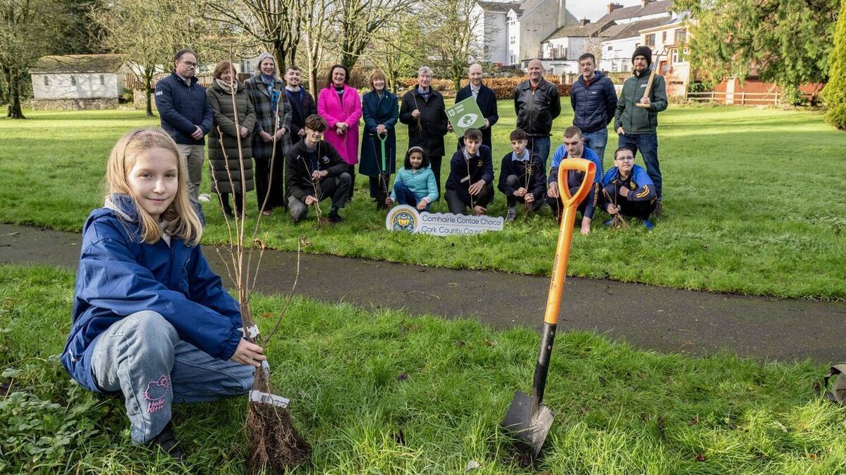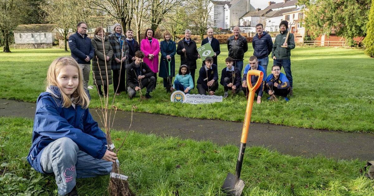 Members of the Climate Action team Cork County Council, Cllr Michael Looney, Diarmuid Hayes of Biodiversity in Schools and teachers and pupils from schools in Macroom. Cork County Council is partnering with Biodiversity in Schools on a tree-planting initiative with schools in Macroom. Pic: Brian Lougheed