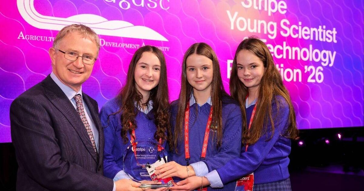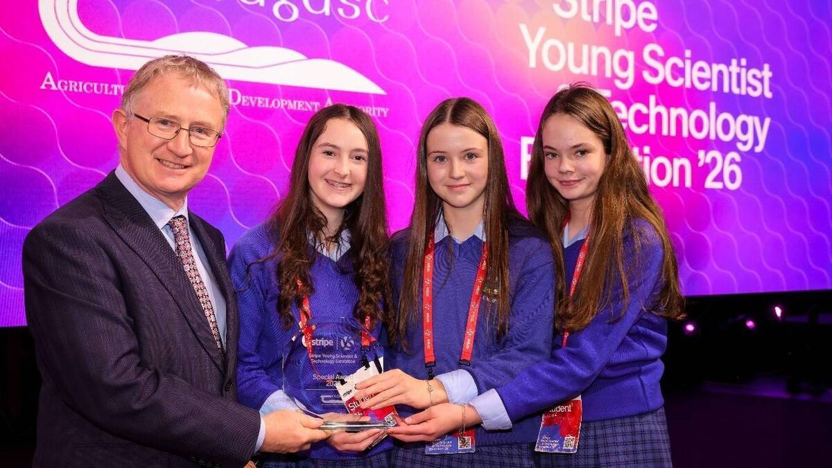 Director of Teagasc, Professor Frank O’Mara, presenting the winners of the Teagasc special award to Méabh Dorgan, Katie Fitzgerald, and Muireann Murphy, of St Mary’s Secondary School, Mallow, at the recent Stripe Young Scientist and Technology Exhibition.