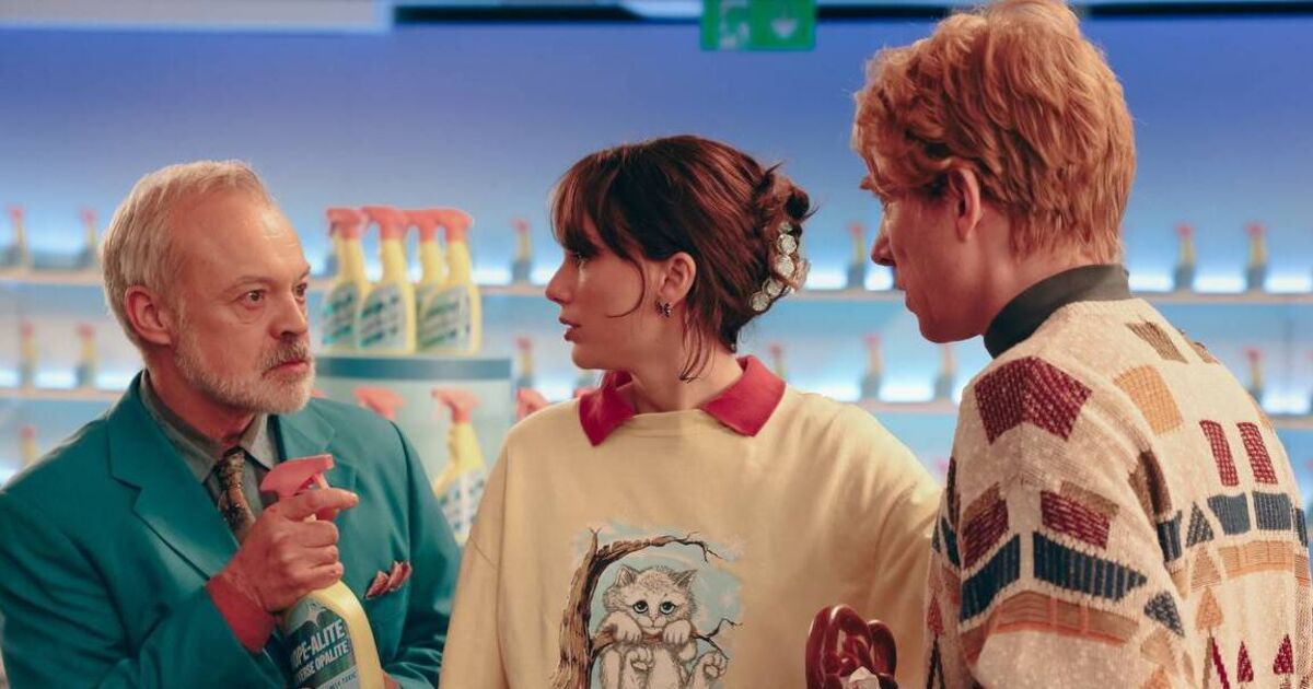 Graham Norton with Taylor Swift and Domhnall Gleeson in the Opalite music video.