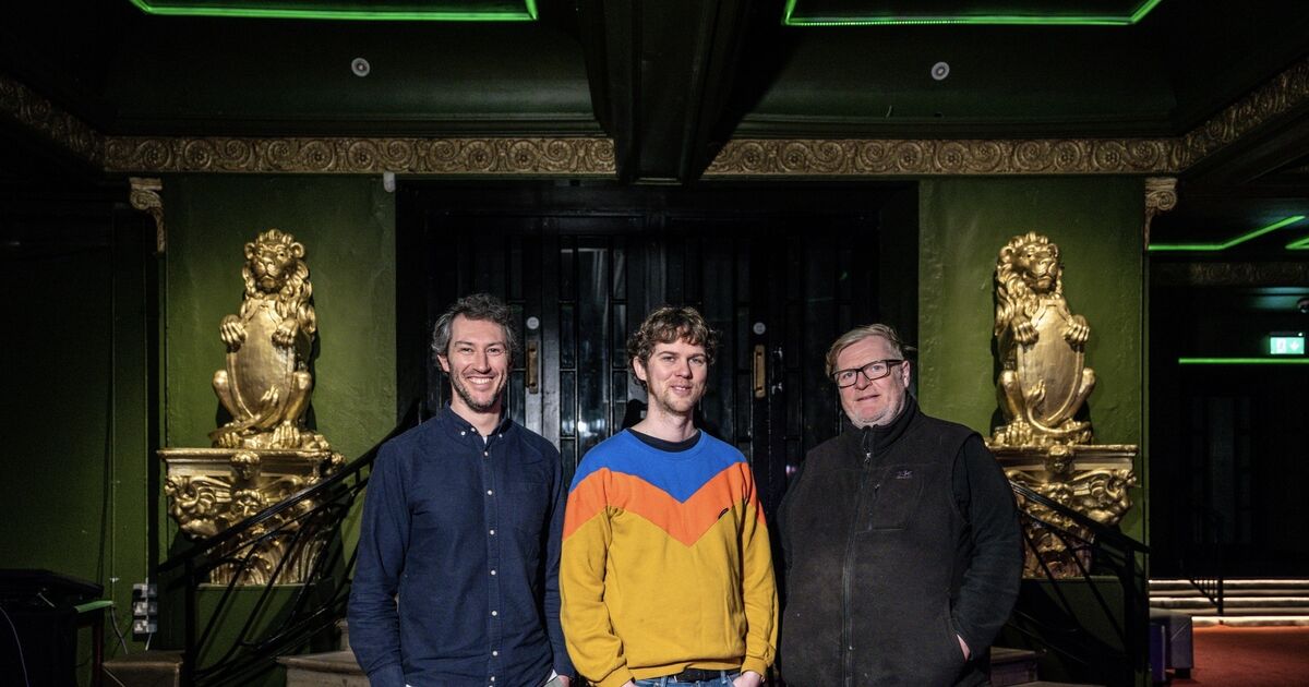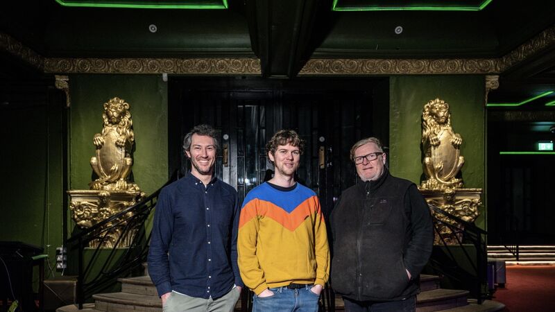 Ed O’Leary, Caoilian Sherlock and Joe Kelly at the foot of the iconic lion steps in the Savoy in Cork City, where the trio have helped transform the historic former cinema foyer into a new bar and live music venue as part of the building’s reopening. Picture: Chani Anderson