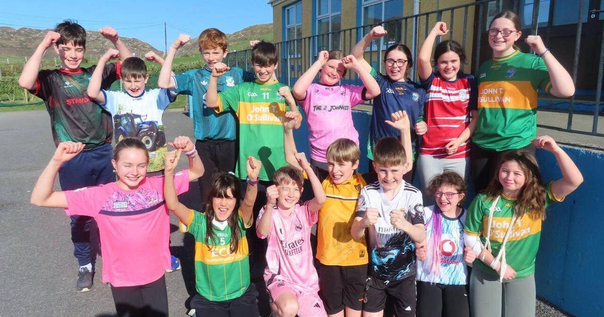 Fourth to sixth class children at Cahermore National School getting ready for the ‘Stand 4 Féile’ Jersey Day on March 20.