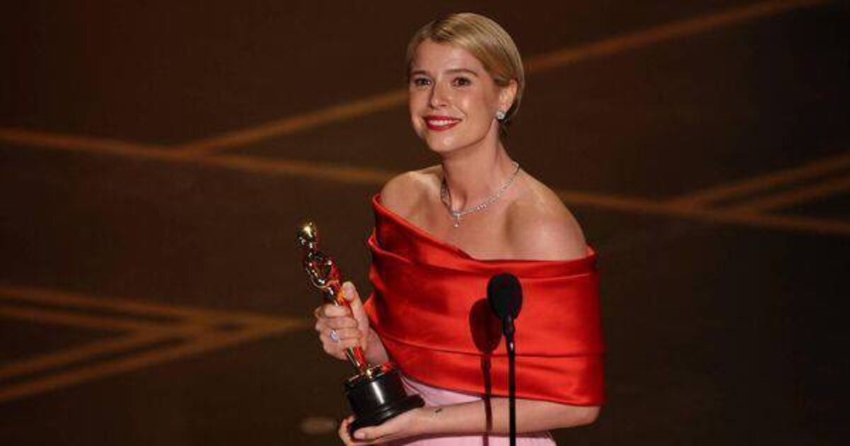 Jessie Buckley on stage at the 98th Annual Academy Awards at the Dolby Theatre in Hollywood last Sunda, holding her Oscar for best actress in a leading role for ‘Hamnet’. Picture: Patrick T. Fallon / AFP via Getty Images)