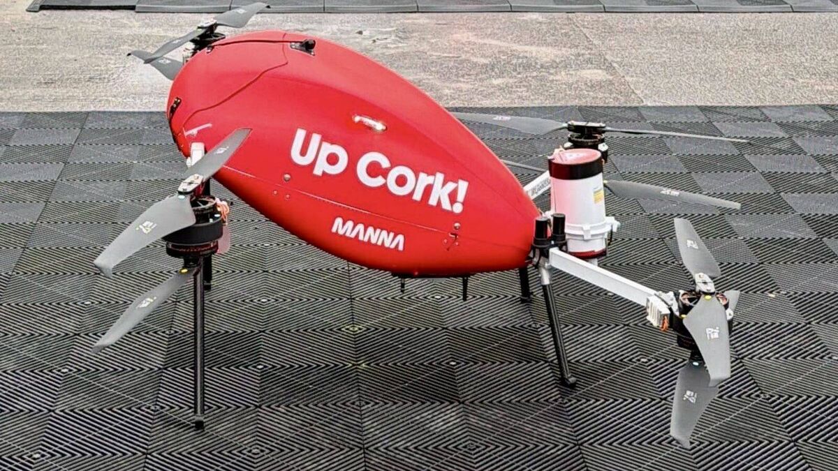 Manna delivery drone in the red colour of Cork with the message Up Cork! printed on the side. Picture: Larry Cummins