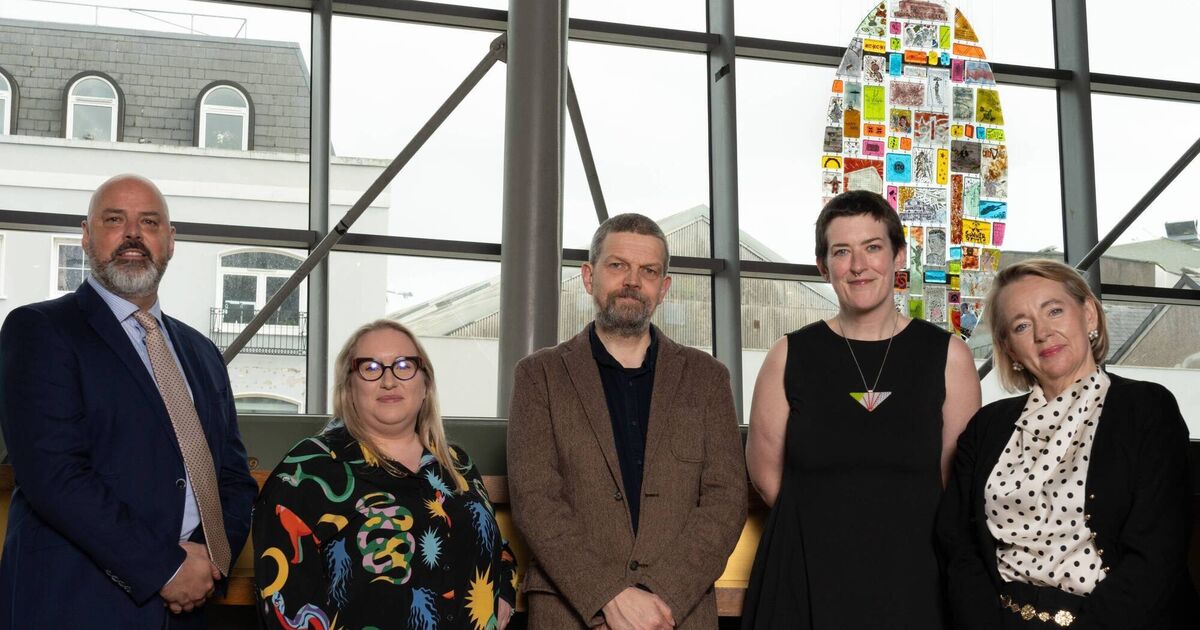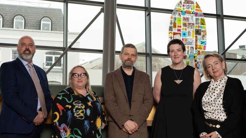 Brian Keehan, Fleetwood Paints; Aoibhie McCarthy, Sample Studios; Brian Mac Domhnaill, Lavit Gallery; artist Sophie Longwill; Eibhlín Gleeson, Cork Opera House, with the newly commissioned artwork in the background. Picture: Roland Paschhoff