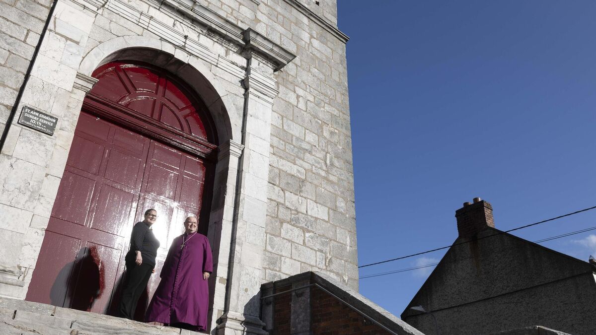 Reverend Meghan Farr, priest in charge at Saint Anne's Shandon, and Bishop of Cork, Cloyne, and Ross, Most Reverend Paul Colton celebrating the renovation work, including the newly-restored 300-year-old front doors. Picture: Clare Keogh