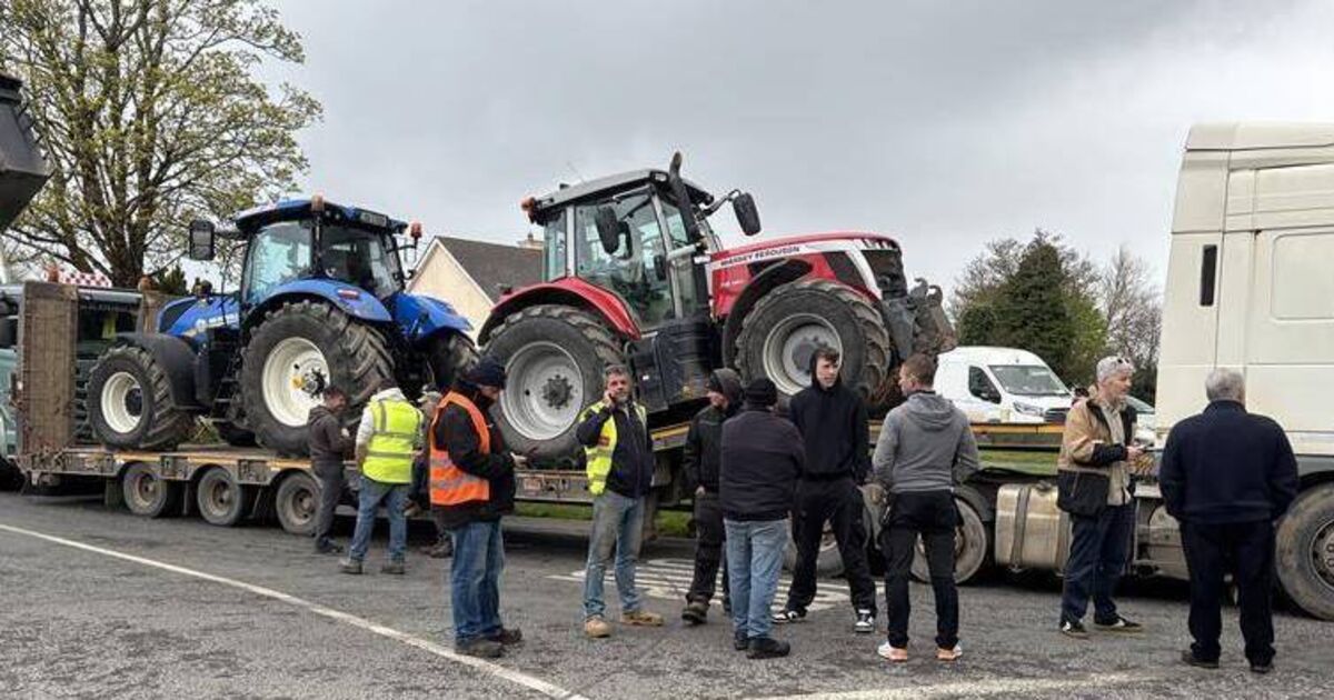 More than 100 people were gathered on the road just after 9am, with more than 60 trucks, tractors, lorries and cars blocking the road from the city side, with traffic diverted through the town.