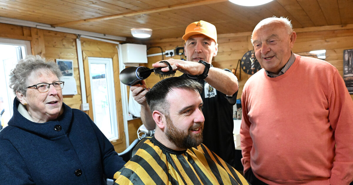 Baldy Barber Mick Moriarty, right, has ‘opened’ another barbershop — but this one isn’t his. Mick cut the ribbon to officially open BuzzCutz Barbershop, run by Donncha O’Connell. Donncha spent 26 years working in The Baldy Barber in Blackpool. Donncha is seen cutting the hair of his godson Paul O’Sullivan with his mother Kitty.