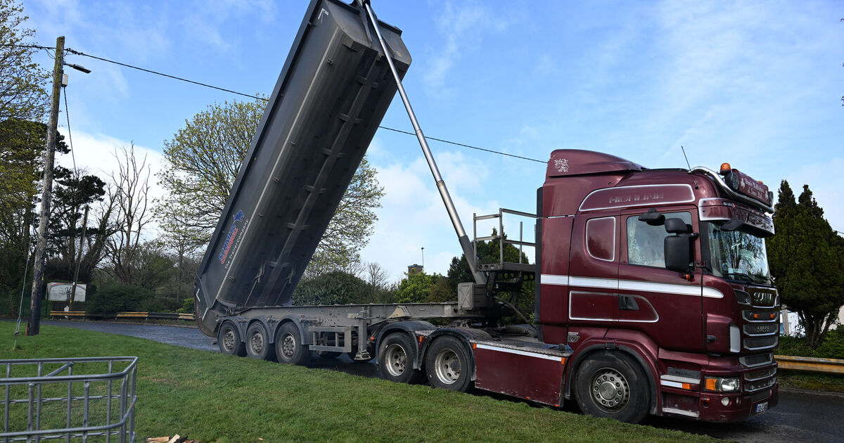 A truck with tipping trailer raised at the Irving Oil refinery blockade at Whitegate, Co Cork. The blockade of the oil refinery has now ceased and protesters have withdrawn. Picture: Larry Cummins