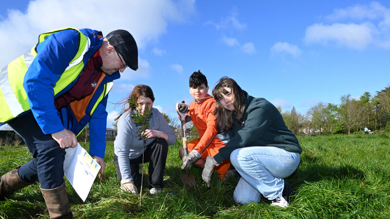Volunteers and families from Rotary Club of Cork planted approximately 50 native Irish oak trees in a grove beside Cork Harbour Greenway, at Mahon, Co Cork, celebrating 100years of the Rotary Club in Cork. Willie O'Brien with Monica, Nathan and Leah Ryan planting an oak tree on Saturday morning. Picture: Larry Cummins