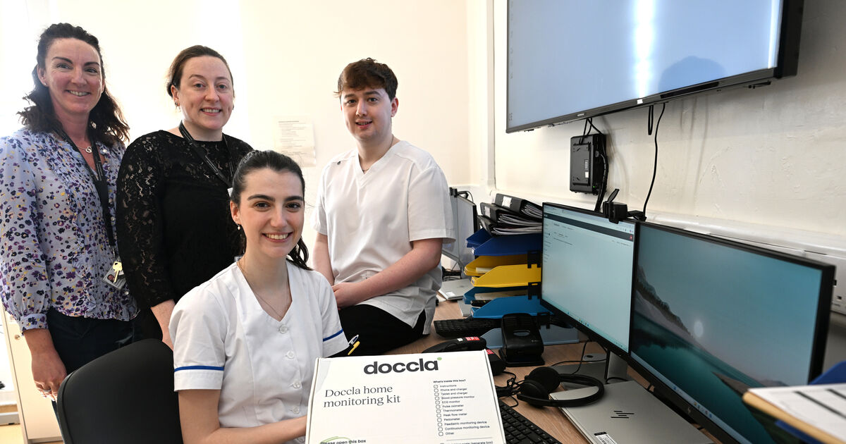 At the virtual monitoring hub in the hospital ward are (rear) Anna Higgins, service improvement lead, Alison Lane, assistant director of nursing, and Aidan Ryan, staff nurse with (seated ) staff nurse Jennifer O’Connell with the box containing the Doccla virtual care home monitoring kit. Picture: Larry Cummins.