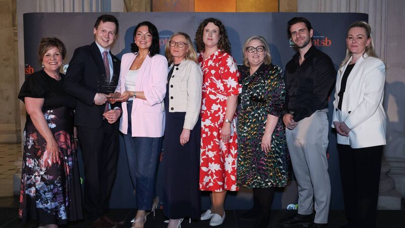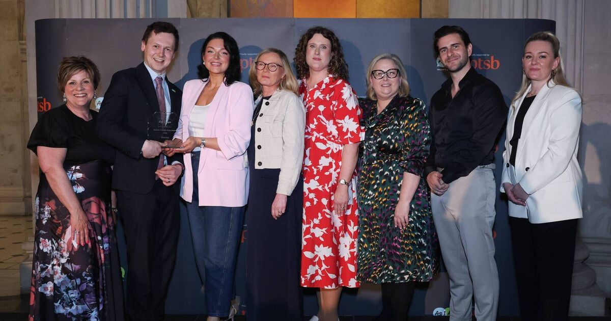 Blarney being awarded autism-friendly town status at the AsIAm Autism Friendly Town Awards: Award judge Catherine Tait; Adam Harris, AsIAm, and Blarney committee representatives Aisling Foley, Mairead Murphy, Sinead Hunt, and Karen Halpin, Eric Roberts, and Courtnee Kyle (PTSB).